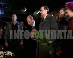 The individuals in the image appear to be formally dressed, standing in what seems like an indoor gathering or solemn event. Based on the context, this might relate to a political or commemorative event, as they exhibit serious expressions and attire appropriate for such occasions.