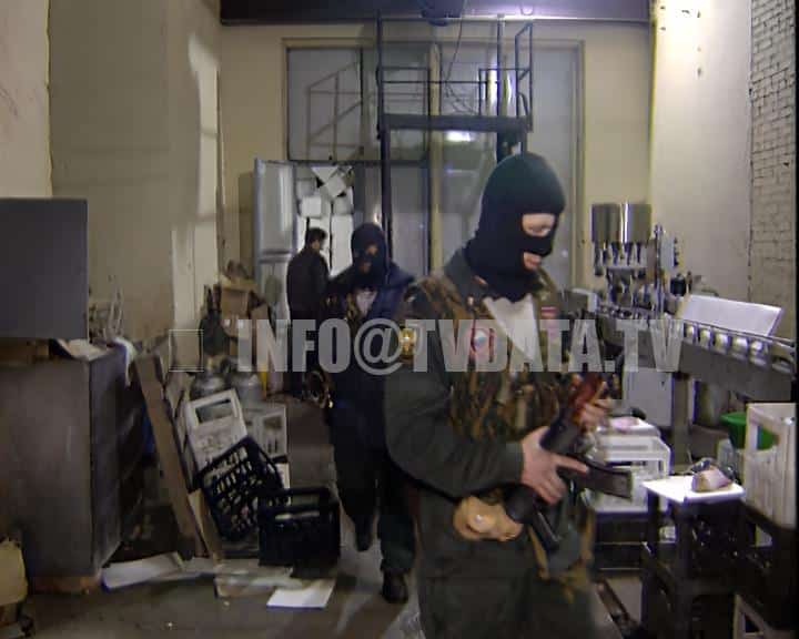 Russian police (MVD) in 90s uniforms busting warehouses (dramatic flashlights, broken bottles on floor). Russian MVD vs Organized Crime (1996) footage.